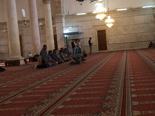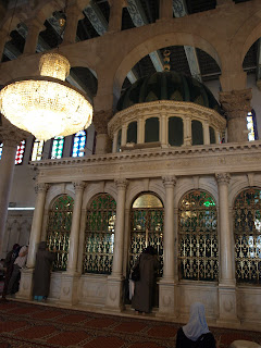 В хотел Газал се връщаме вече като у нас си. Позната обстановка, която ти дава повече спокойствие. И повече самочувствие. След бърз душ тръгваме по позната улица , преминаваме по познат надлез, подушваме позната миризма ( на отходен канал) и влизаме в познатия ни вече сук на Стария Дамаск. Направо сме си „стари кучета”.Омаядската джамия е място , което те кара да се замислиш за предназначението на религиите. Една от най-старите в света, джамията е един огромен двор , на който вместо огради има постройки,в които всъщност са джамии. Вътре, в двора ,свободното постранство е идеално чисто. Всички се събуват и с обувки в ръка ходят по излъскания мрамор. Излъскано , както се казва, муха да кацне ще се разчекне. Край едната стена многолюдно семейство е постлало голямо покривало и насядали по земята, се хранят. Влизаме в една от джамиите - Омаядската. Вътре, с дебело въже ,по дължина е разделено на две части. Отпред е за мъже. За жените - отзад. Сигурно когато жените се молят, да не ти идват нечестиви мисли. Все пак е свято място. В мъжката част на две отделни редици са се наредили мъже и се молят в синхрон. Без да се впечатляват, че „неверници” като нас ги зяпат любопитно. И дори ги снимат. В средата има голям параклис, достъпен и от мъжете, и от жените. Вътре в огромен ковчег, покрит с покров, изписан на арабски е главата на Йоан Кръстител!