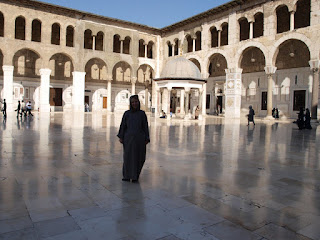В хотел Газал се връщаме вече като у нас си. Позната обстановка, която ти дава повече спокойствие. И повече самочувствие. След бърз душ тръгваме по позната улица , преминаваме по познат надлез, подушваме позната миризма ( на отходен канал) и влизаме в познатия ни вече сук на Стария Дамаск. Направо сме си „стари кучета”.Омаядската джамия е място , което те кара да се замислиш за предназначението на религиите. Една от най-старите в света, джамията е един огромен двор , на който вместо огради има постройки,в които всъщност са джамии. Вътре, в двора ,свободното постранство е идеално чисто. Всички се събуват и с обувки в ръка ходят по излъскания мрамор. Излъскано , както се казва, муха да кацне ще се разчекне. Край едната стена многолюдно семейство е постлало голямо покривало и насядали по земята, се хранят. Влизаме в една от джамиите - Омаядската. Вътре, с дебело въже ,по дължина е разделено на две части. Отпред е за мъже. За жените - отзад. Сигурно когато жените се молят, да не ти идват нечестиви мисли. Все пак е свято място. В мъжката част на две отделни редици са се наредили мъже и се молят в синхрон. Без да се впечатляват, че „неверници” като нас ги зяпат любопитно. И дори ги снимат. В средата има голям параклис, достъпен и от мъжете, и от жените. Вътре в огромен ковчег, покрит с покров, изписан на арабски е главата на Йоан Кръстител!